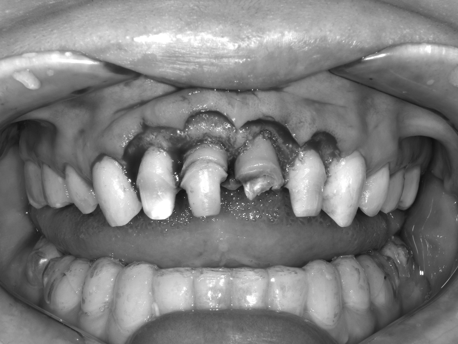 歯肉を切開し、歯根を露出させた状態。