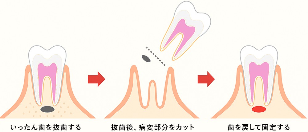 「意図的再植」は、いったん歯を抜き、炎症部位を直接処置してから元の位置に戻す高度な治療法です。