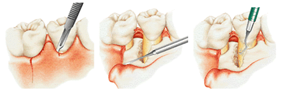 歯ぐきを切開して歯根を露出させ、歯石や感染組織を徹底的に除去した後、縫合します。